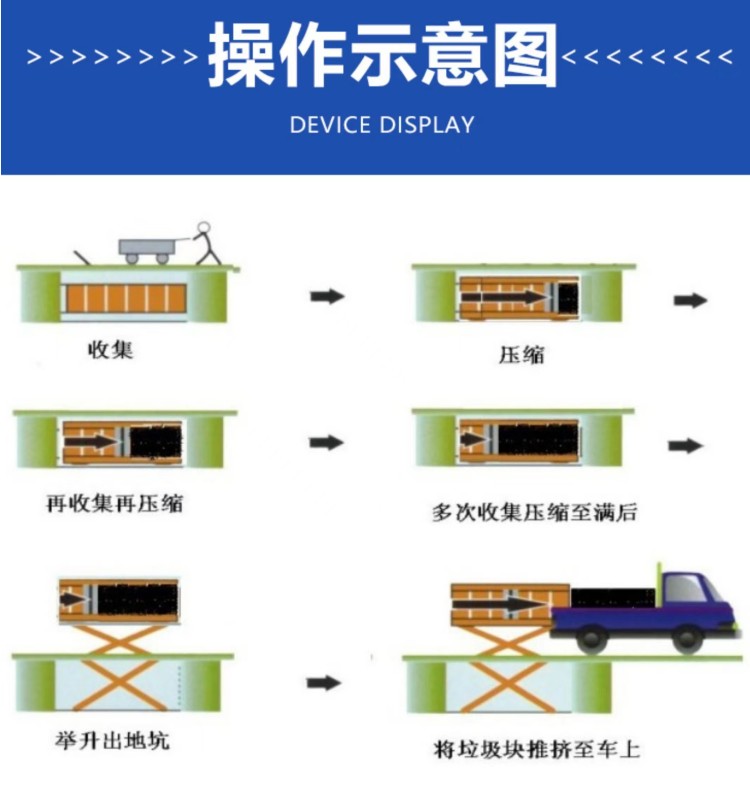 水平式生活垃圾壓縮中轉(zhuǎn)設(shè)備是將垃圾的卸(出)料、壓縮、儲(chǔ)存集合在一起,整體落于地下,利用地下空間將垃圾密閉在箱體內(nèi),地面上無(wú)垃圾外露現(xiàn)象,壓縮垃圾產(chǎn)生的污水經(jīng)排污管道直接流入污水井內(nèi),然后由污水泵排到城市污水管網(wǎng),徹底解決了垃圾在收集、儲(chǔ)存、裝運(yùn)過(guò)程中的污染環(huán)境、作業(yè)效率低等問(wèn)題。