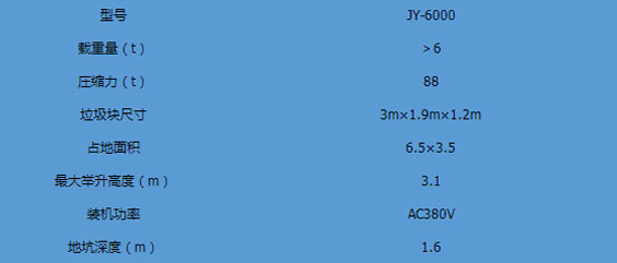 地埋式垃圾中轉(zhuǎn)站主要特點(diǎn):1.平穩(wěn)可靠:兩側(cè)舉升,剪叉跨度大,升降平穩(wěn),無(wú)傾斜。2.全封閉水平壓縮:垃圾壓實(shí)密度≧0.86t/m,大幅度節(jié)約轉(zhuǎn)運(yùn)成本。3.淺地坑:地坑深度僅為1.55m,保潔及維修極為方便。4.高效率:壓實(shí)每噸垃圾時(shí)間≤10min。 主要技術(shù)參考:型號(hào)JY-6000載重量(t)>6圧縮力(t)88垃圾塊尺寸3m1.9m1.2m...